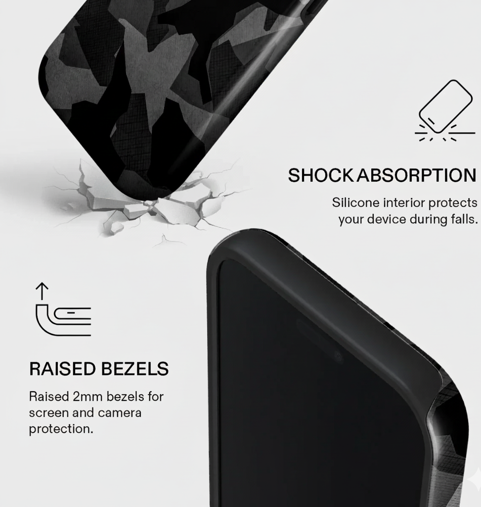 Engineered for real life. Dual-layer construction with a rigid outer shell and impact-absorbing core. Drop-tested protection, raised lips for screen and camera safety, and a secure grip for confident handling. Built to survive the worst drops.